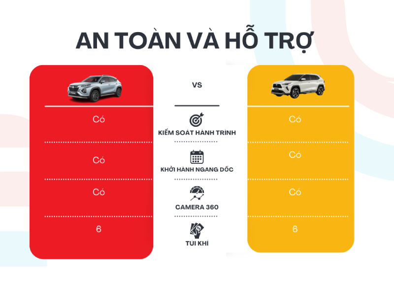 Toyota Yaris Cross không hề kém cạnh. Nhiều phiên bản được trang bị gói Toyota Safety Sense (TSS), bao gồm các tính năng như cảnh báo tiền va chạm, giữ làn, kiểm soát hành trình thích ứng… Đây là điểm cộng lớn nếu bạn cần một chiếc xe an toàn cao cho cả gia đình.