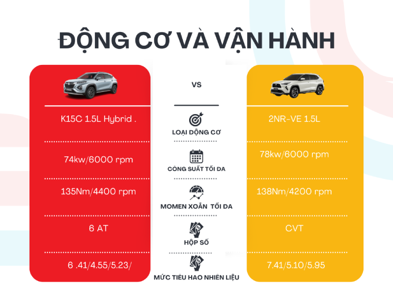 Ngược lại, Toyota Yaris Cross mang đến lựa chọn động cơ rất đa dạng. Theo tài liệu kỹ thuật, phiên bản hybrid của Yaris Cross sử dụng động cơ 1.5L kết hợp mô tơ điện, công suất khoảng 116 PS (tùy bản) cùng mô-men xoắn mạnh mẽ. Đây là lợi thế lớn nếu bạn ưu tiên tiết kiệm nhiên liệu, đặc biệt trong di chuyển đô thị.